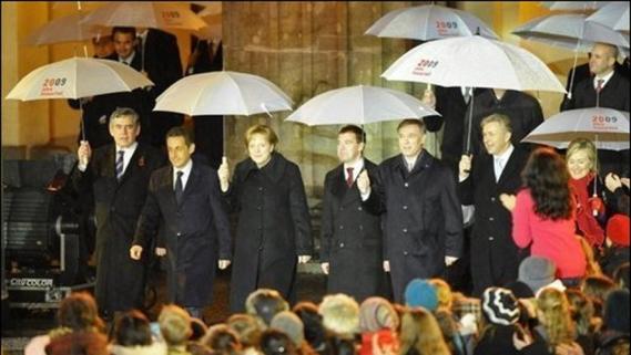 De g à d: Gordon Brown, Nicolas Sarkozy, Angela Merkel, Dmitri Medvedev, Horst Koehler, Klaus Wowereit et Hillary Clinton franchissent la Porte de Brandebourg, le 9 novembre 2009 à Berlin