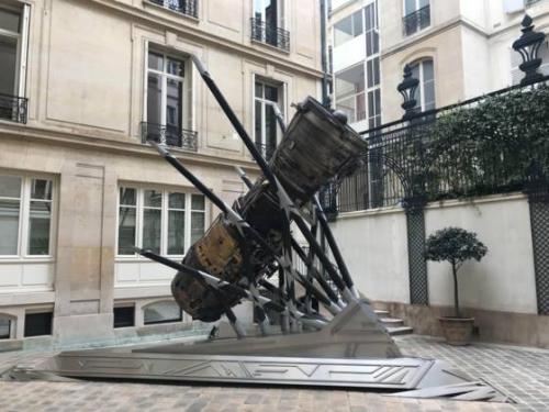 Au siège de la Compagnie Edmond de Rothschild à Paris, difficile de passer à côté de cet immense tas de ferraille planté au milieu de la cour. Quésaco ? "Une œuvre d’art commandée par le baron Benjamin de Rothschild à l’artiste Philippe Druillet", nous renseigne la directrice des relations extérieures de la maison, Florence Gaubert. Cette pièce unique a été composée à partir d’un moteur de Concorde que le milliardaire a acheté aux enchères il y a quelques années. Elle est soutenue par cinq flèches, le symbole historique des Rothschild.