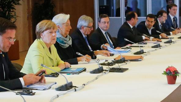 Angela Merkel, Christine Lagarde (FMI), Jean-Claude Juncker (Commission), Mario Draghi (BCE), François Hollande et Alexis Tsipras