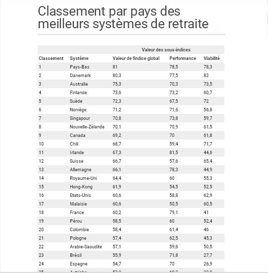 La France a-elle vraiment l’un des meilleurs systèmes de retraite au monde ? À en croire la 11e édition du rapport annuel sur les systèmes de retraite à travers la planète, c’est loin d’être le cas. Sur les 37 pays étudiés par ce spécialiste en retraite et investissements, l’Hexagone occupe la 18e position et perd même une place par rapport à l’année dernière. La France arrive notamment derrière Singapour, la Malaisie et juste devant le Pérou. Le podium est occupé par l’Europe du nord. La première place revient aux Pays-Bas et la deuxième au Danemark. La Finlande vient compléter le podium.